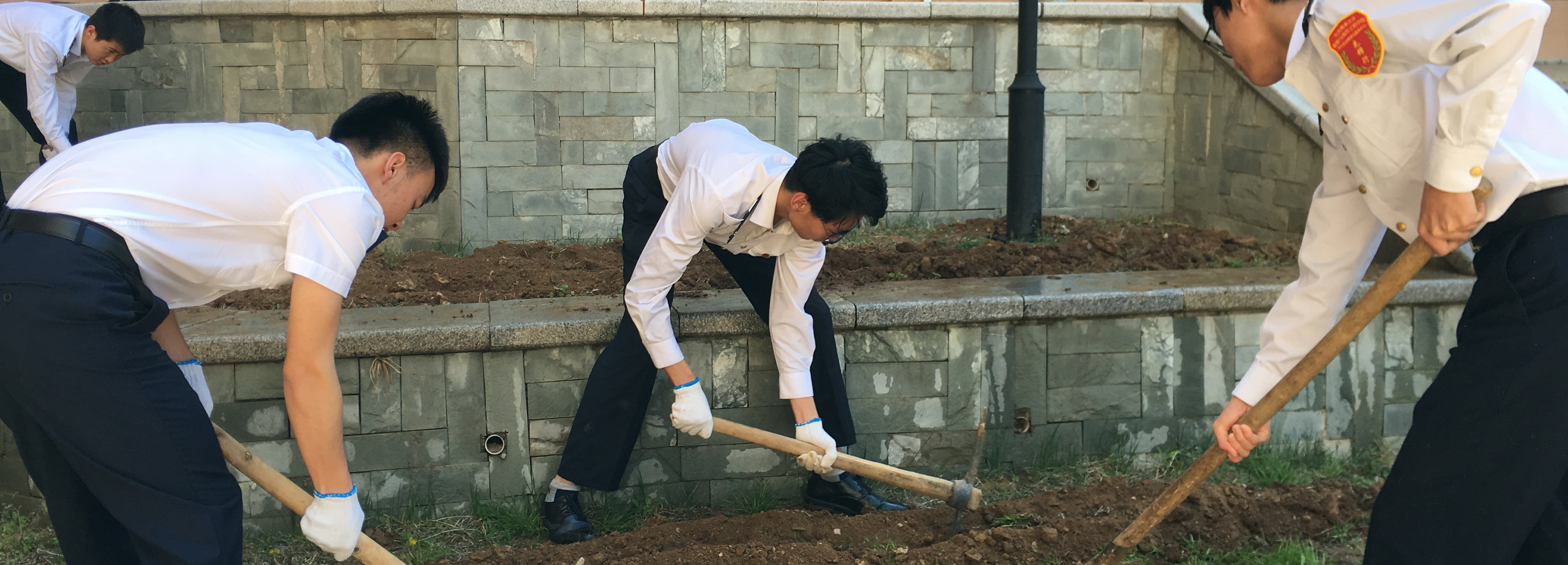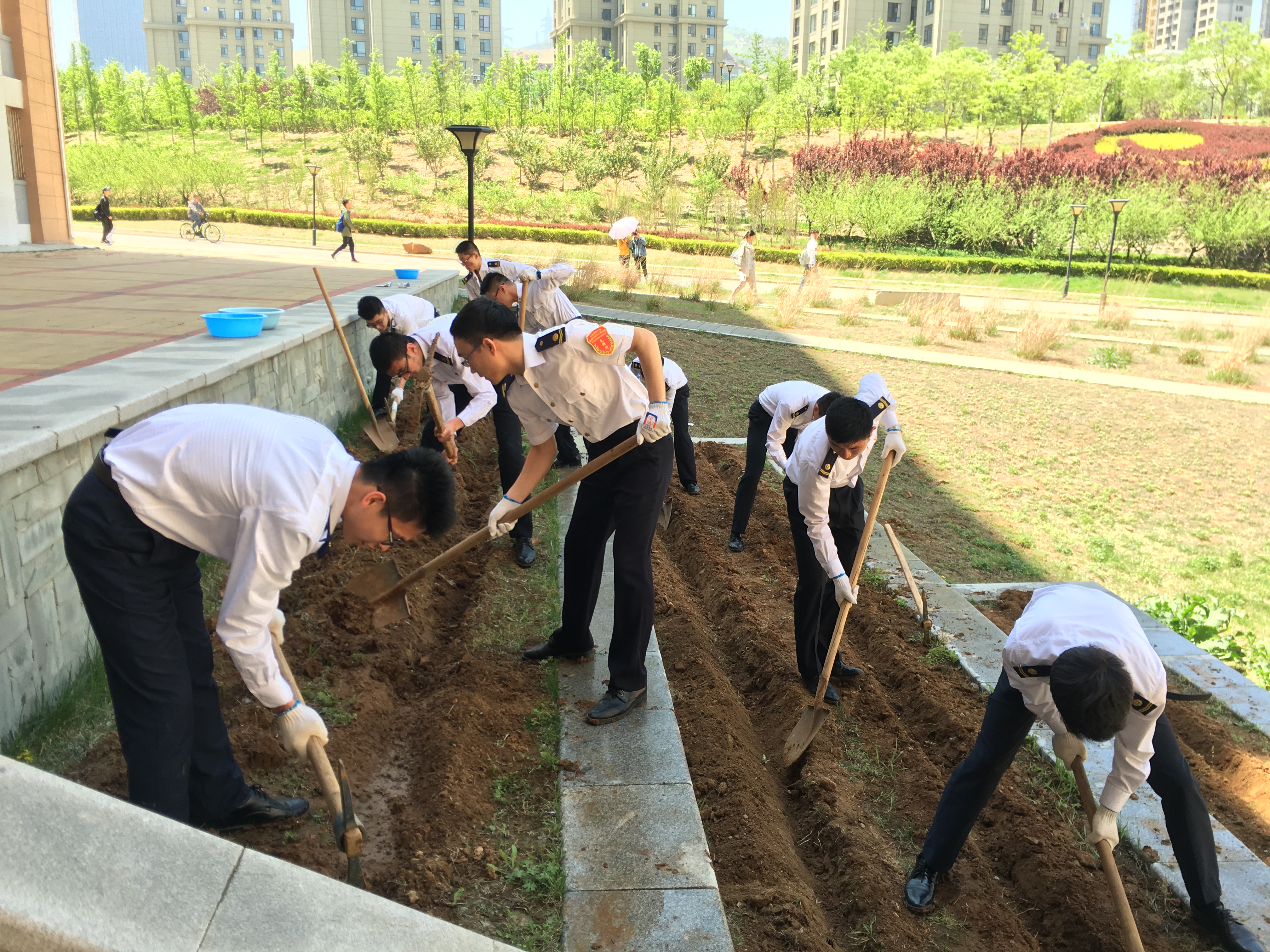 6日中�12点整,暖风习习,整个海大笼罩在午间轻松愉悦的氛围中,中心全体成员已经备好手套、铁锹等工具,按部门列队、分组分工,投入到紧张有序的劳动中。从清理荒地碎石砖块、拔除杂草,到测距定点、划线挖沟,不知不觉一个小时已经过去,荒废已久的空地已经焕然一新。次日正午,中心成员们将提前用生根粉浸泡过的月季花株搬运至栽种地点,沿着之前挖好的花沟一人栽花浇水、一人填土推平,配合默契。中心成员的行动引得不少经过的行人驻足,大家在了解成员们的行动后纷纷表示:一定会好好保护这片意义非凡的花木,用花香祝福海大生日快乐�