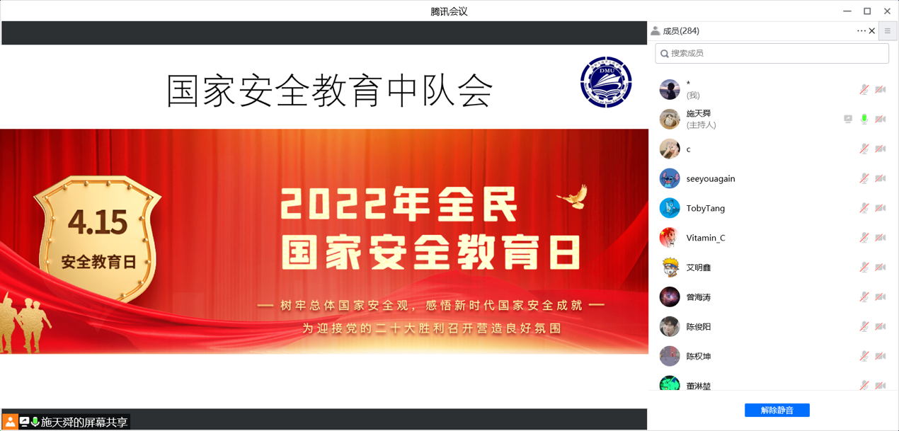 �2014�4�15日习近平总书记在中央国家安全委员会第一次会议上创造性提出总体国家安全观,2022�4�15日已是我国第七个全民国家安全教育日。会上,施天舜带领同学们了解什么是国家安全、国家安全包含哪些方面以及公民在维护国家安全中应尽的义务和享有的权利。然后举例生活中可能危害国家安全的活动,以及应对这些活动应采取的措施�