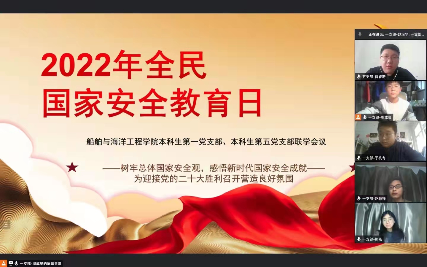 党有号召,团有响应�4�4日,船舶与海洋工程学院团委组织同学们观看“千万师生同上一堂国家安全教育课”主题公开课,并以“树牢总体国家安全观”为主题积极开展线上讨论活动,营造国家安全良好氛围。此外,学院团委就政治安全、信息安全、网络安全、文化安全、密码安全等校园国家安全领域组织团干重点学习,为切实履行维护国家“五大安全”政治使命打下良好基础�