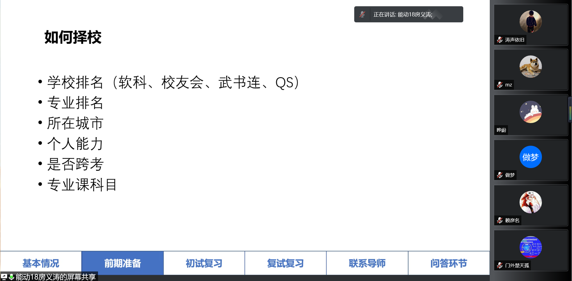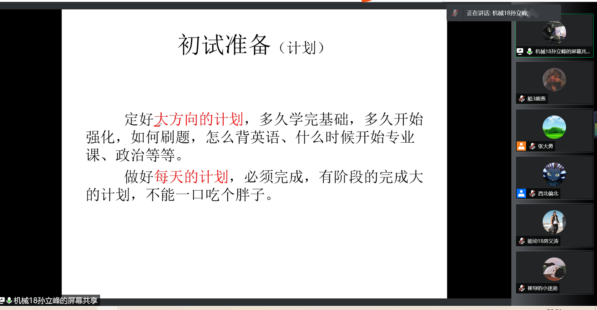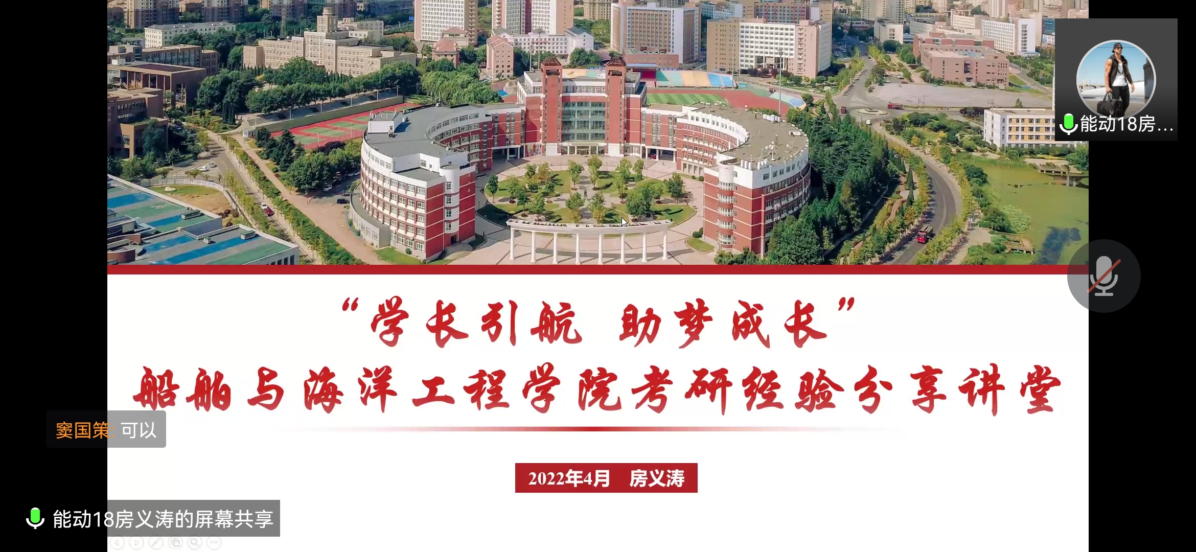 为更好地服务学院有考研意向的同学,帮助此类同学为考研做好准备,充分发挥学�“传帮带”的优良传统�4�0日,船舶与海洋工程学院开展了“学长引� 助梦成长�考研经验分享线上讲堂,由学院2018中队房义涛等4名考研上岸的学长作为主讲嘉宾,为学弟学妹们做经验分享,会议持续两个多小时,反响热烈�