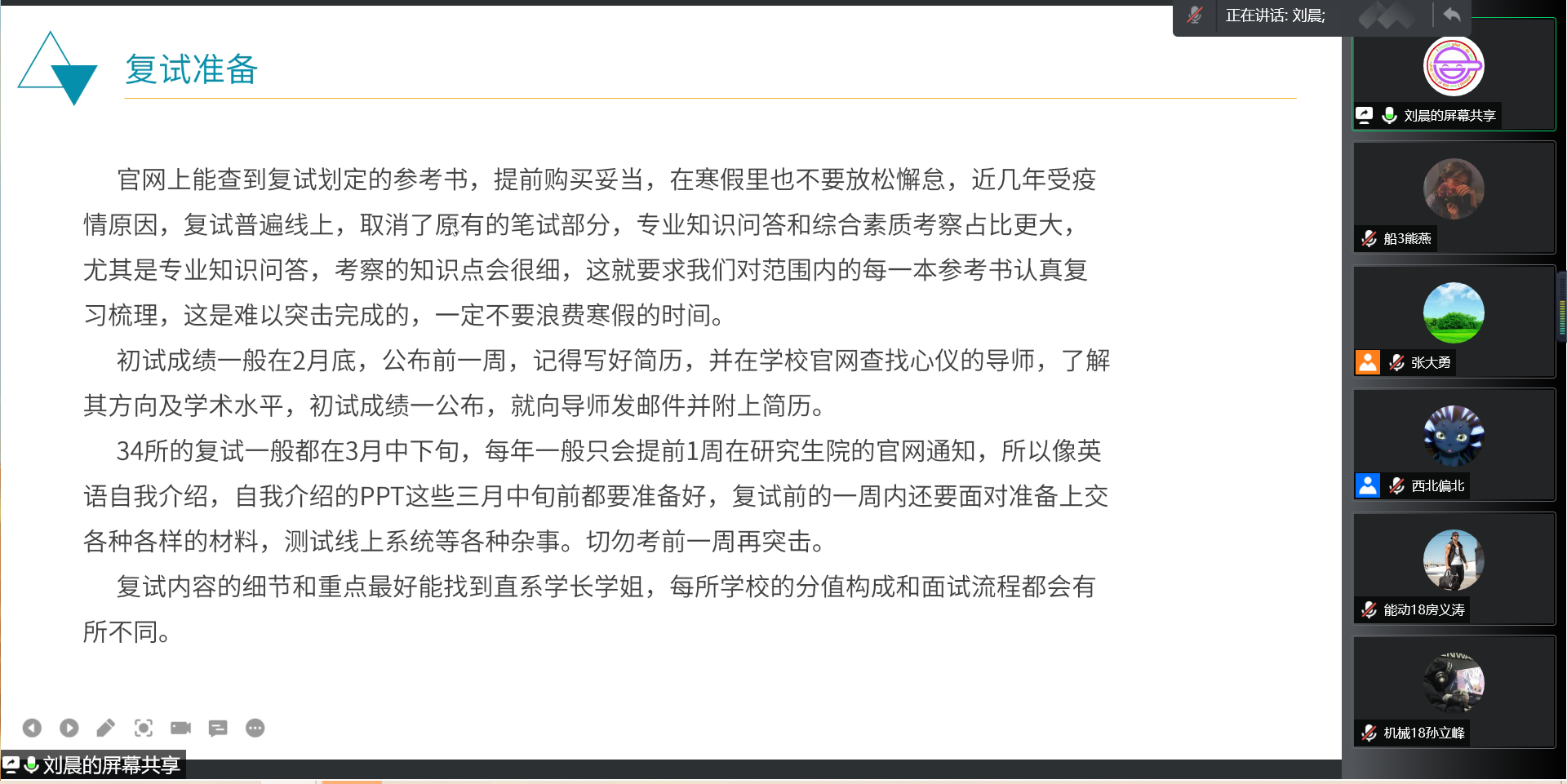 房义涛、刘晨两人通过分析近些年考研的基本情况,推荐同学们参考一些与择校相关的依据,同时详细介绍了查找往年招生数据的渠道,并强调信息收集能力的重要性。随后,两人展示了自己针对考研初试、复试的学习安排,分享各科学习资料并推荐可靠的老师�up主,同时嘱咐同学们在备战考研过程中脚踏实地,保持自信的心态�