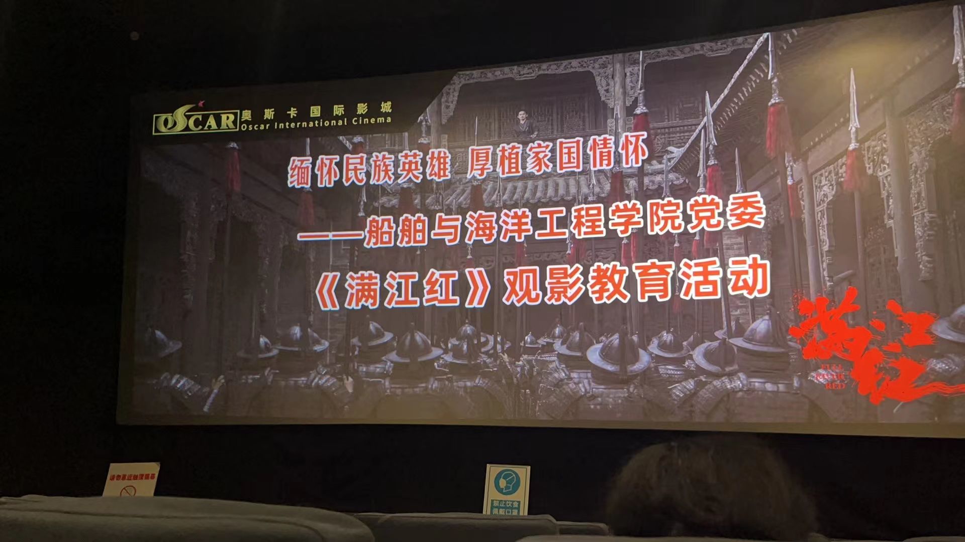 电影《满江红》以“一词压两宋,一人抵万军”的著名爱国将领岳飞精忠报国,壮志未酬的家国情怀为背景,以全新的视角诠释传说中的未解之谜,通过刻画一群奋勇向前、舍生取义、保家卫国、可歌可泣小人物,在跌宕起伏的情节中,在感人至深的故事里,彰显出崇高的爱国主义精神。影片的高潮是禁军齐声复诵诗词《满江红》,响彻云霄的全军复诵,澎湃激昂的抗敌斗志,引得全场师生党员热泪盈眶�